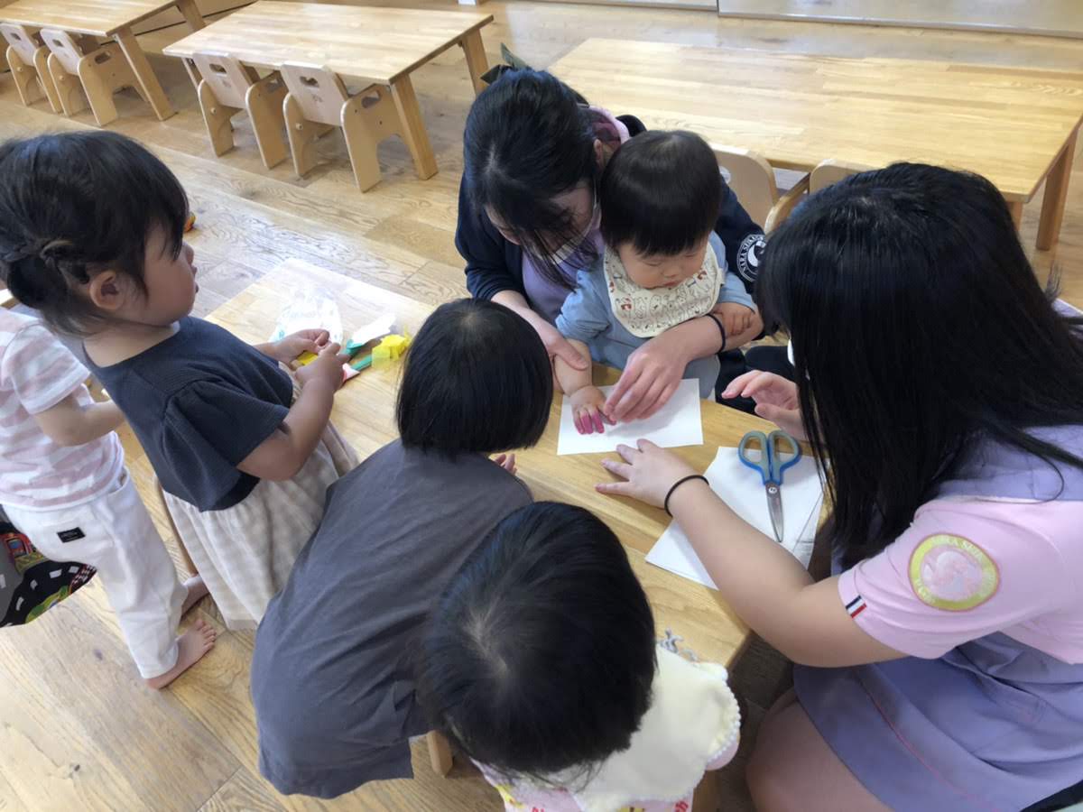 1歳児いちご組のお友だちは、お花紙が破れないように先生の真似っこをしながら、